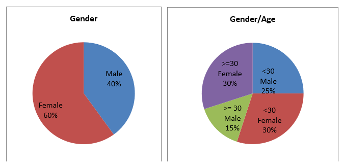 Age < 30: 550 (250 males and 300 females) Age >= 30: 450 (150 males and 300 females)