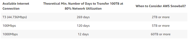 - Snowball: Petabyte-scale, cheaper than internet transfer