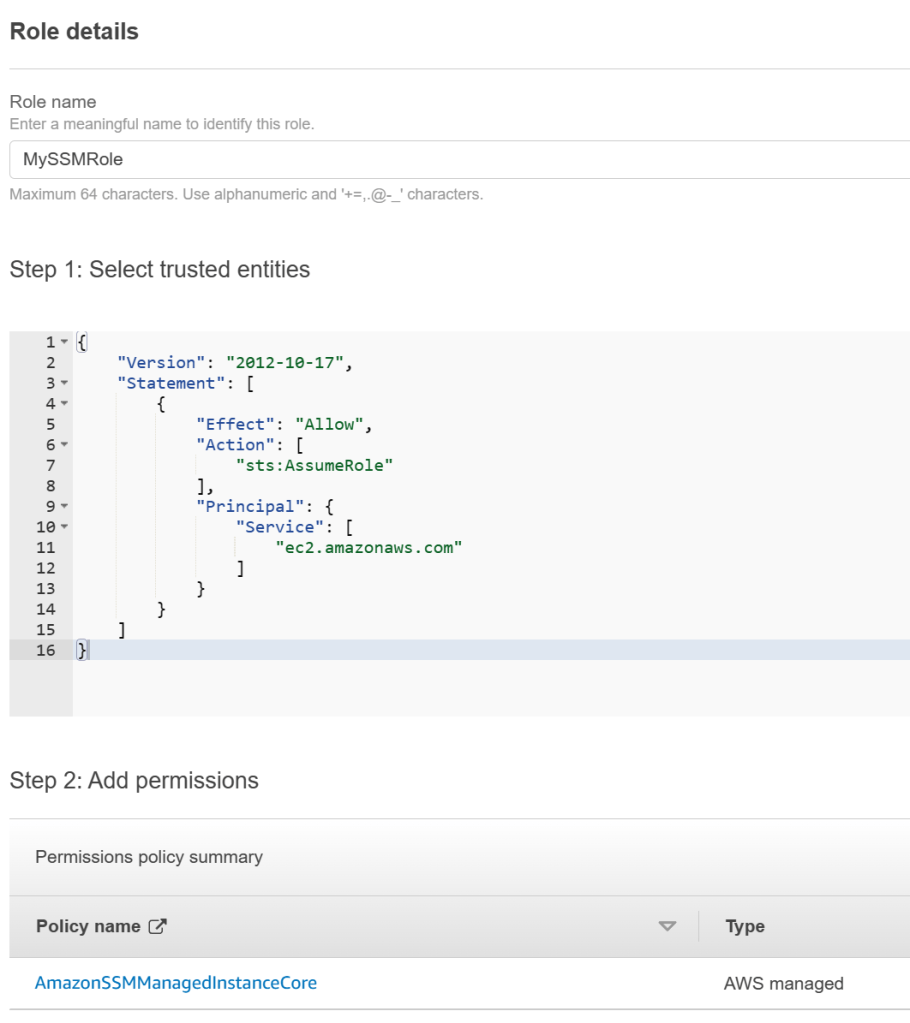 - Managed Policy: AmazonSSMManagedInstanceCore