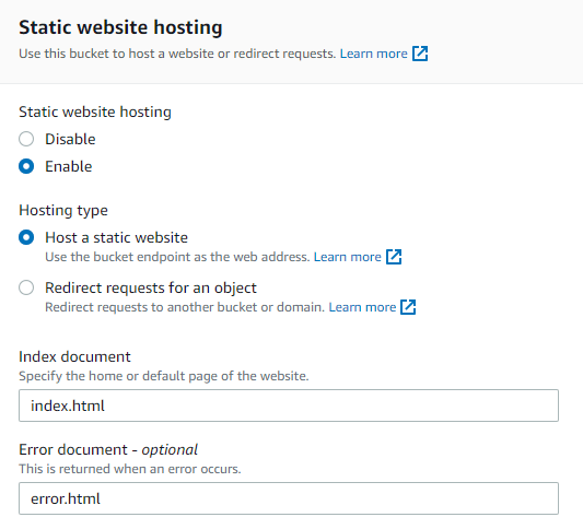 - On the bucket “Properties” tab, enable “Static website hosting.”