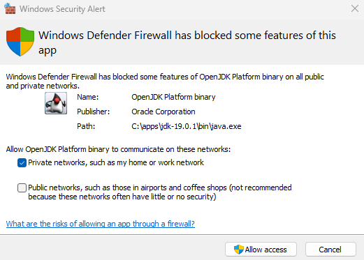 Windows Defender firewall might block to run the java.exe. Click the “Allow access” button.